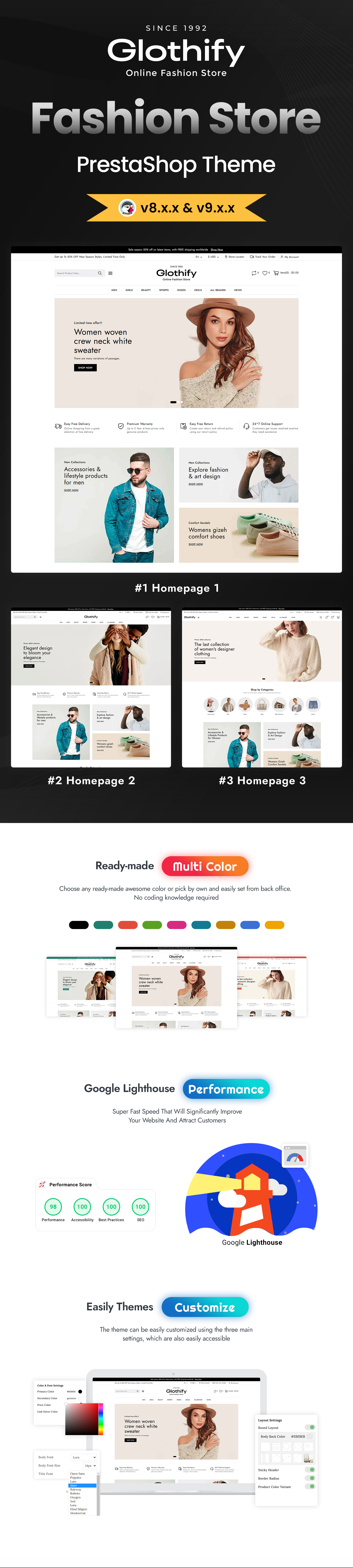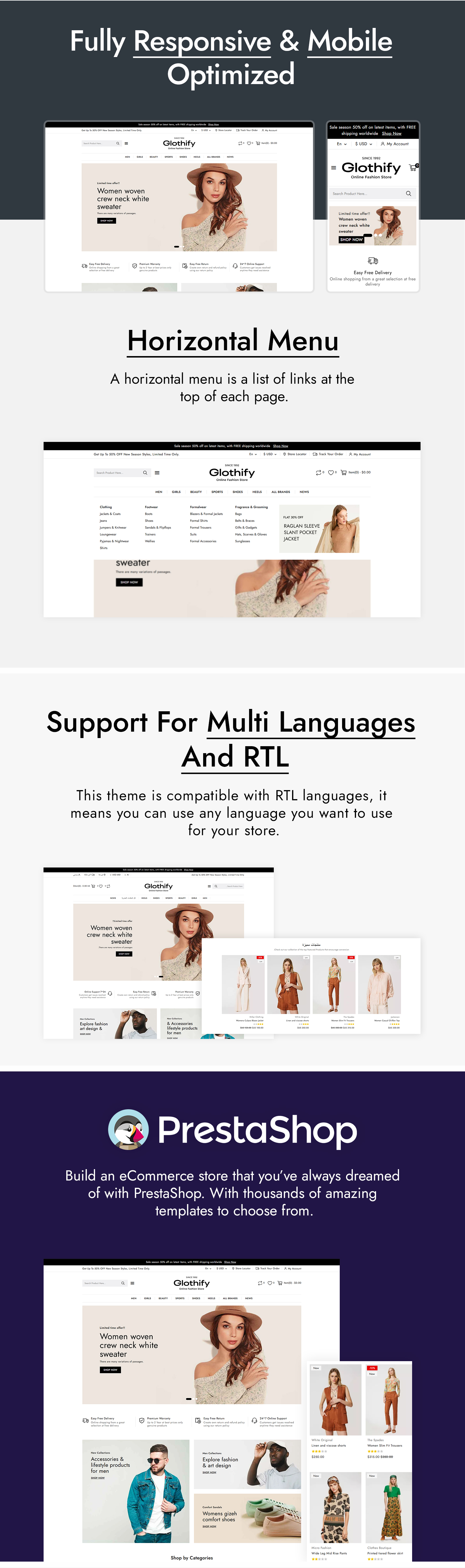 The Glothify theme for Prestashop was developed with a lack of feature capabilities. In the Glothify theme, there are many additional features accessible, such as the ideal menu design style, sharing home page slider, completely supported responsive layout, RTL, quick-view, ajax filter and Quick-Start package. Glothify theme buyers will collaborate with us as both clients and business partners. With the goal of creating actual friends, we have prepared to provide excellent support services for designing your store. We provide support services from our real technical staff. You can join the group of happy customers that adore us!