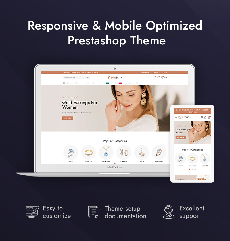 Jeweelish is a refined and luxurious PrestaShop responsive theme tailored for jewelry boutiques, designer ornaments, fashion accessories stores, handcrafted jewelry, and premium lifestyle brands. Its elegant layout, polished typography, and visually rich presentation style allow your products to shine and attract attention at first glance.